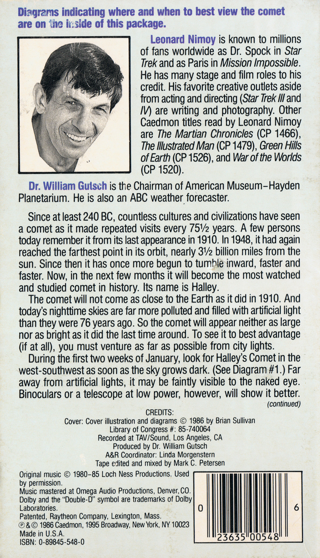 Leonard Nimoy HALLEY'S COMET Once in a Lifetime Narrated by Leonard Nimoy Original Space Music and Sound Effects by Geodesium. Notes by Dr. William Gutsch. Leonard's Record Page Write Me!