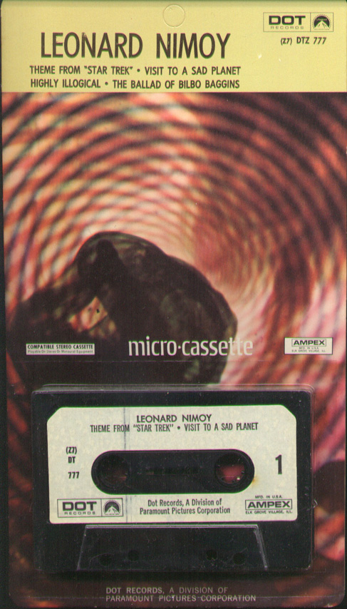 Leonard Nimoy "MICRO CASSETTE" On DOT Records (Z7 DTZ 777). Side One has "THEME FROM STAR TREK" and "VISIT TO A SAD PLANET." Side Two contains "HIGHLY ILLOGICAL" and "THE BALLAD OF BILBO BAGGINS." "DOT RECORDS A DIVISION OF PARAMOUNT PICTURES CORPORATION AMPEX TAPES."